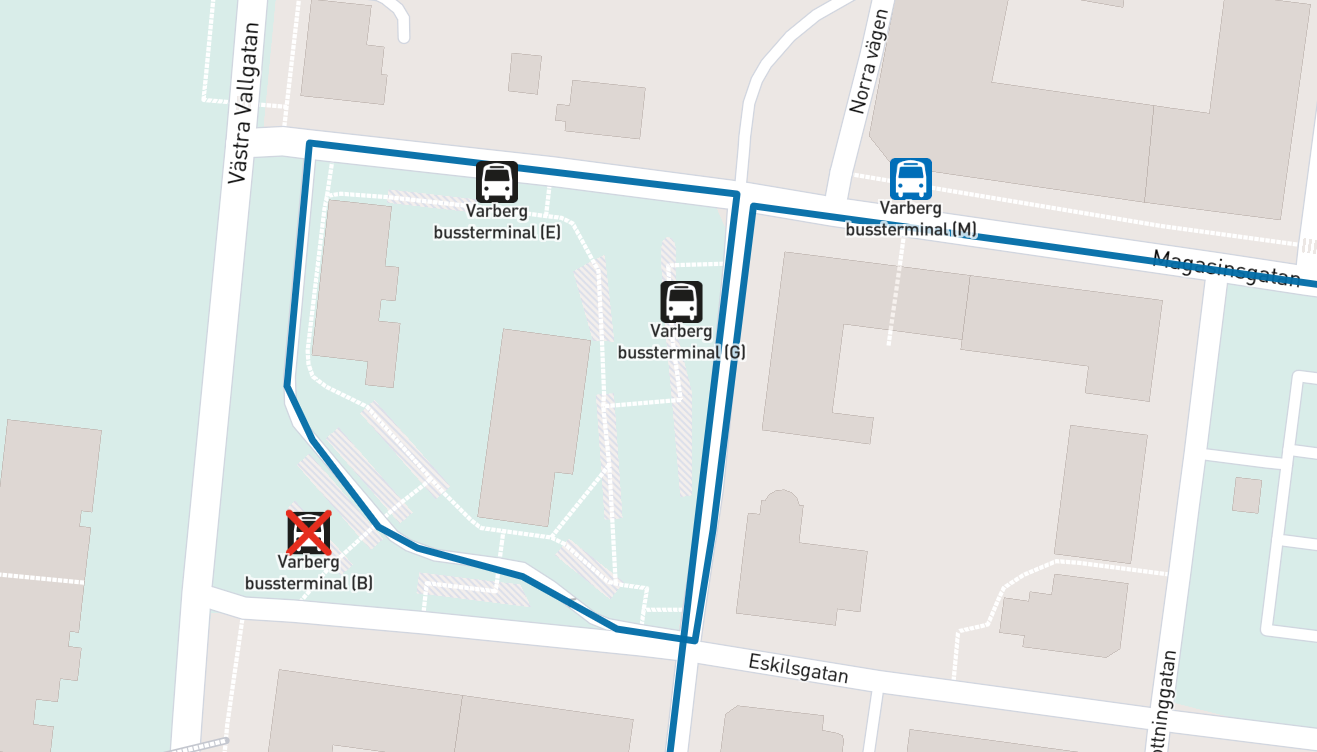 Hållplatserna Idrottshallen, Arena Varberg och Kattegattsvägen är indragna. Resenärer hänvisas till Rödaledstigen och Drottning Blankas plats. Orsaken är vägarbete.