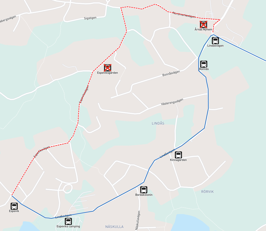 Hållplatserna Espeviksgården och Årnäs Nyhem dras in med start 16/2 till 4/3 . Resenärer hänvisas till närliggande hållplatser Lindåsvägen och Espervik.